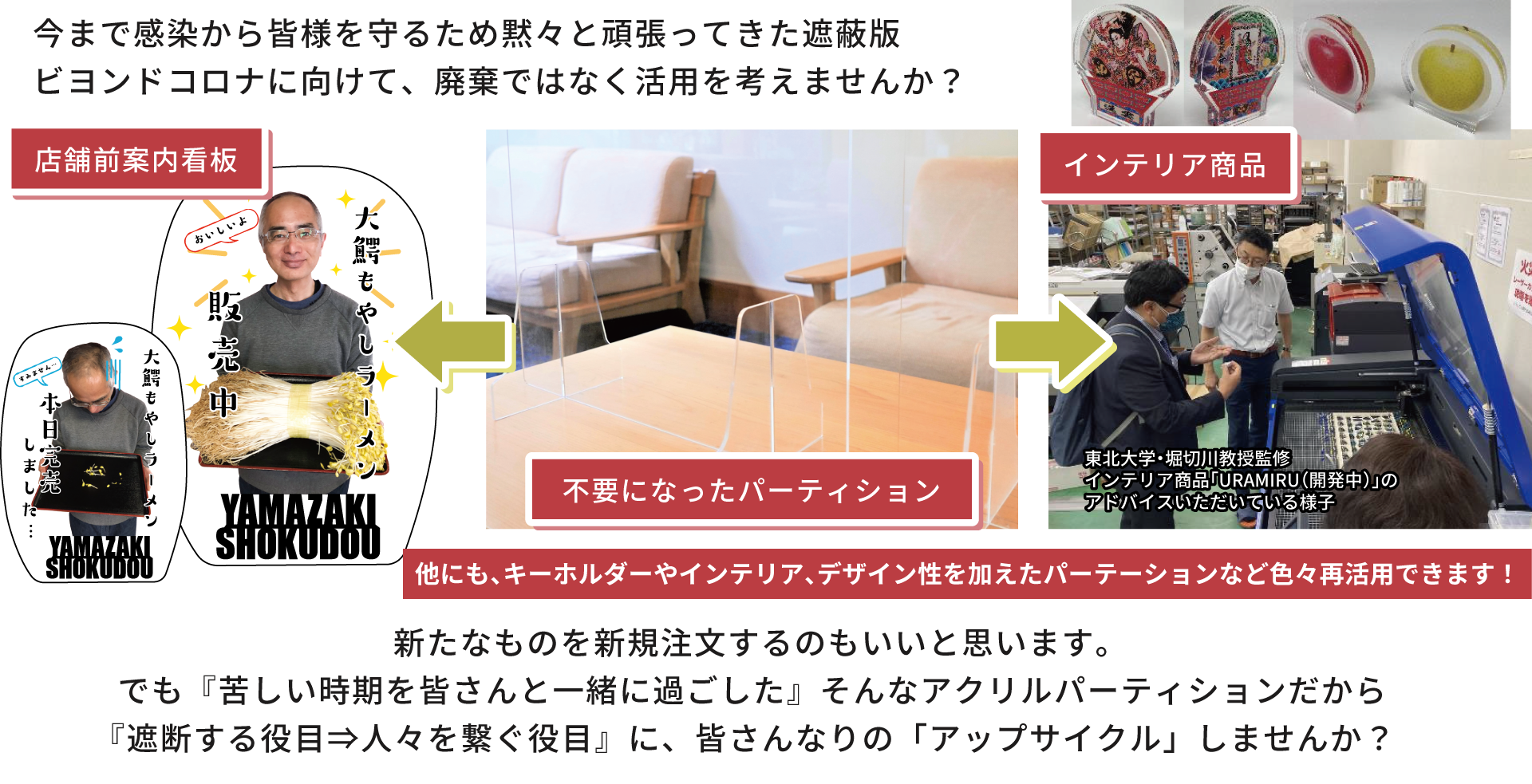 アップサイクルプロジェクトの一環として、大鰐もやしラーメンが看板メニューの『山崎食堂』(青森県大鰐町)とコラボレーションし、店舗で不要になったアクリルのパーティションをお客様への案内パネルにアップサイクルしました。