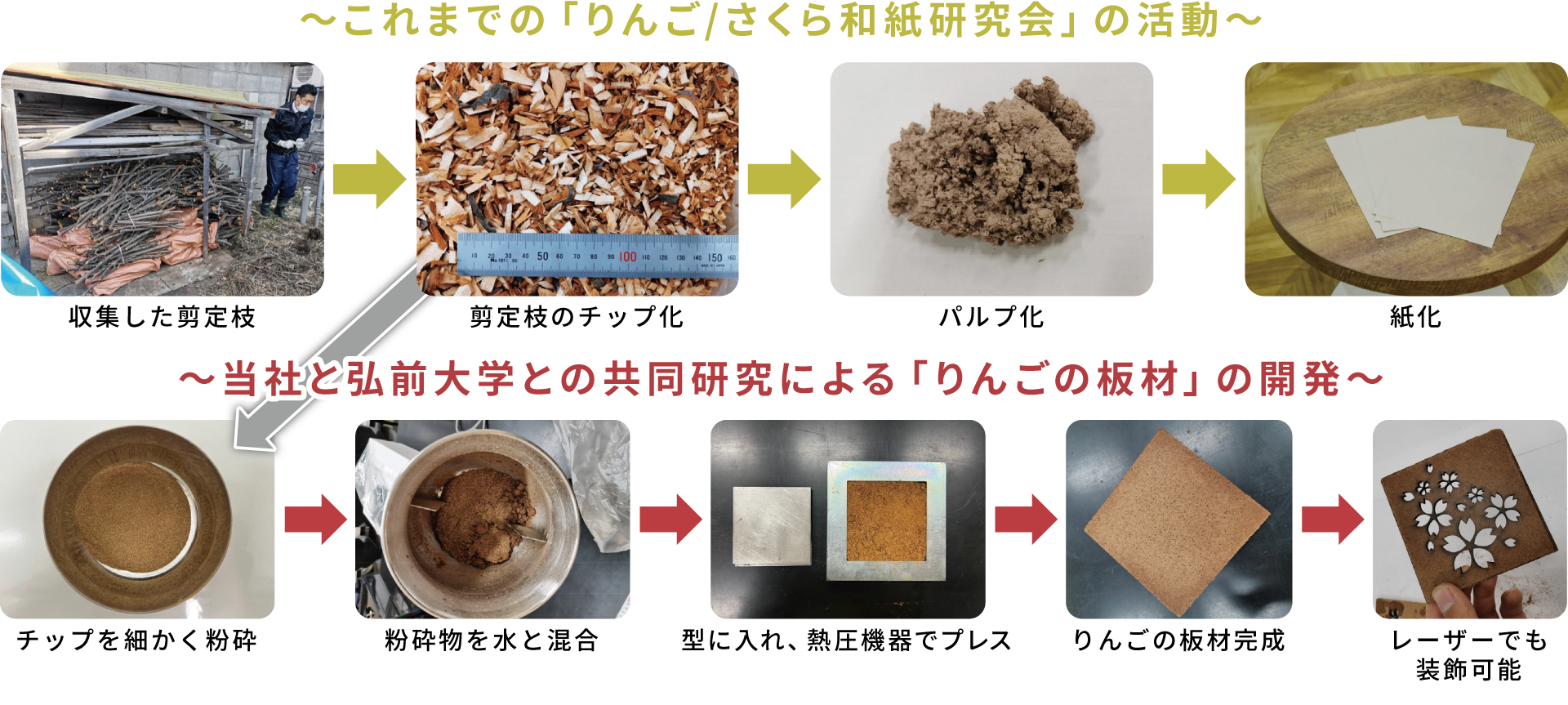 当プロジェクトは「りんご/さくら和紙研究会」の活動からスピンアウトした、アップサイクルプロジェクトです。当社は弘前大学(青森県弘前市)教育学部の廣瀬孝准教授が会長を務めるひろさき産学官連携フォーラム内の「りんご/さくら和紙研究会」に参加し「りんご剪定枝和紙」の普及活動を行っていました。