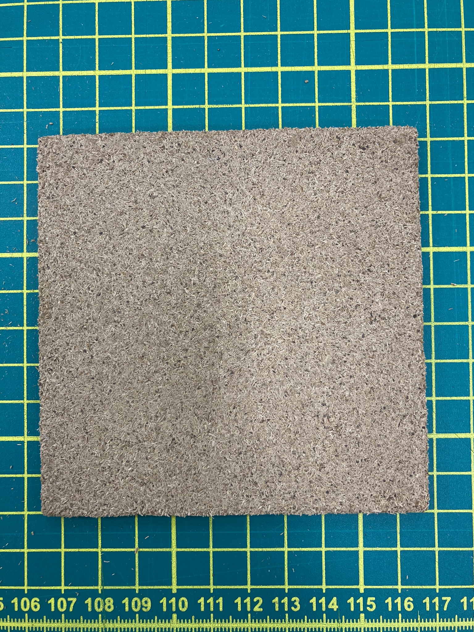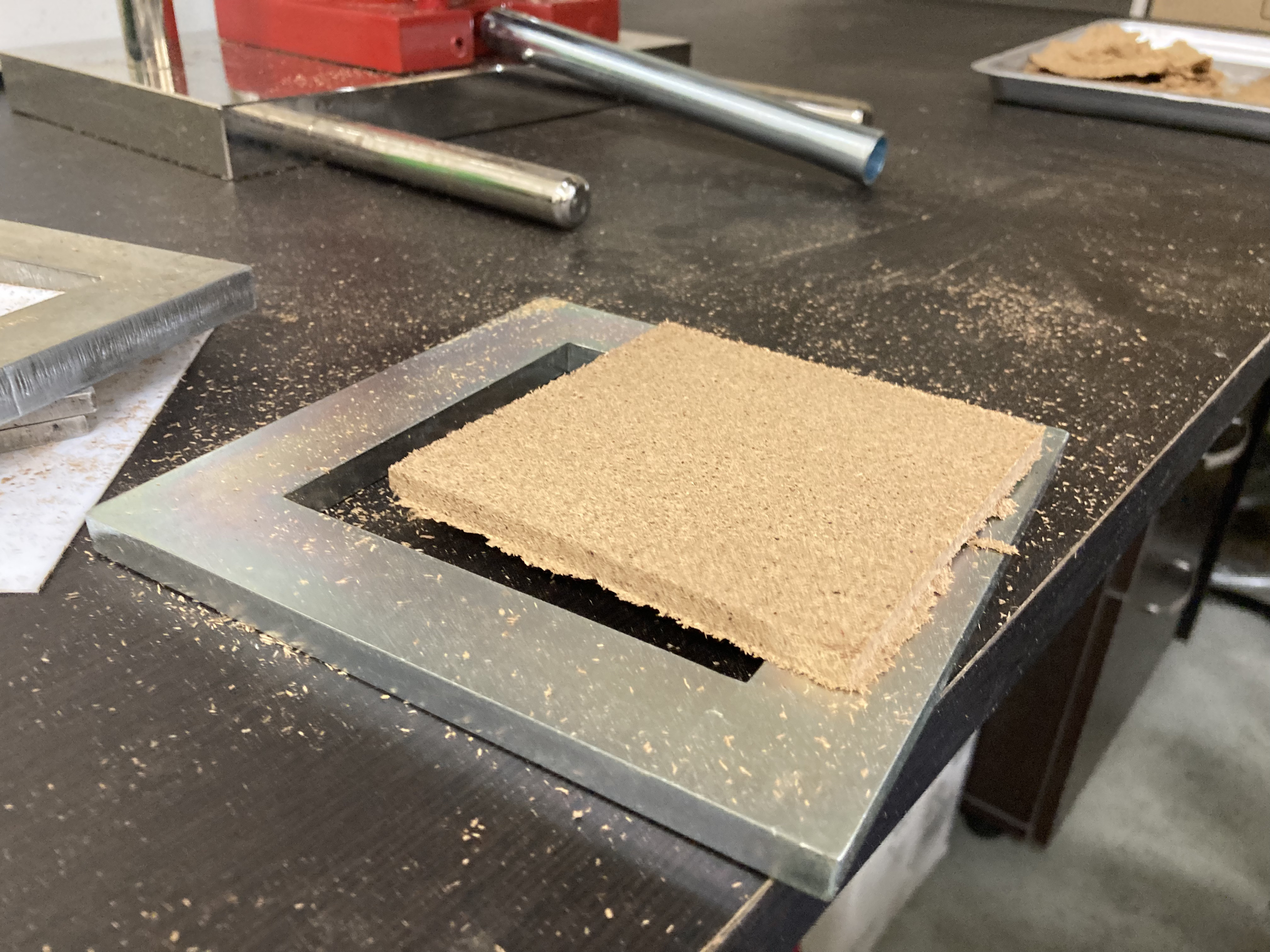 試作は熱プレス機を使用して、接着剤の種類や塗布量の条件を変えながら作成するのですが試作を重ねていく過程で、水と剪定枝のみでボードを作ることが出来ました。
