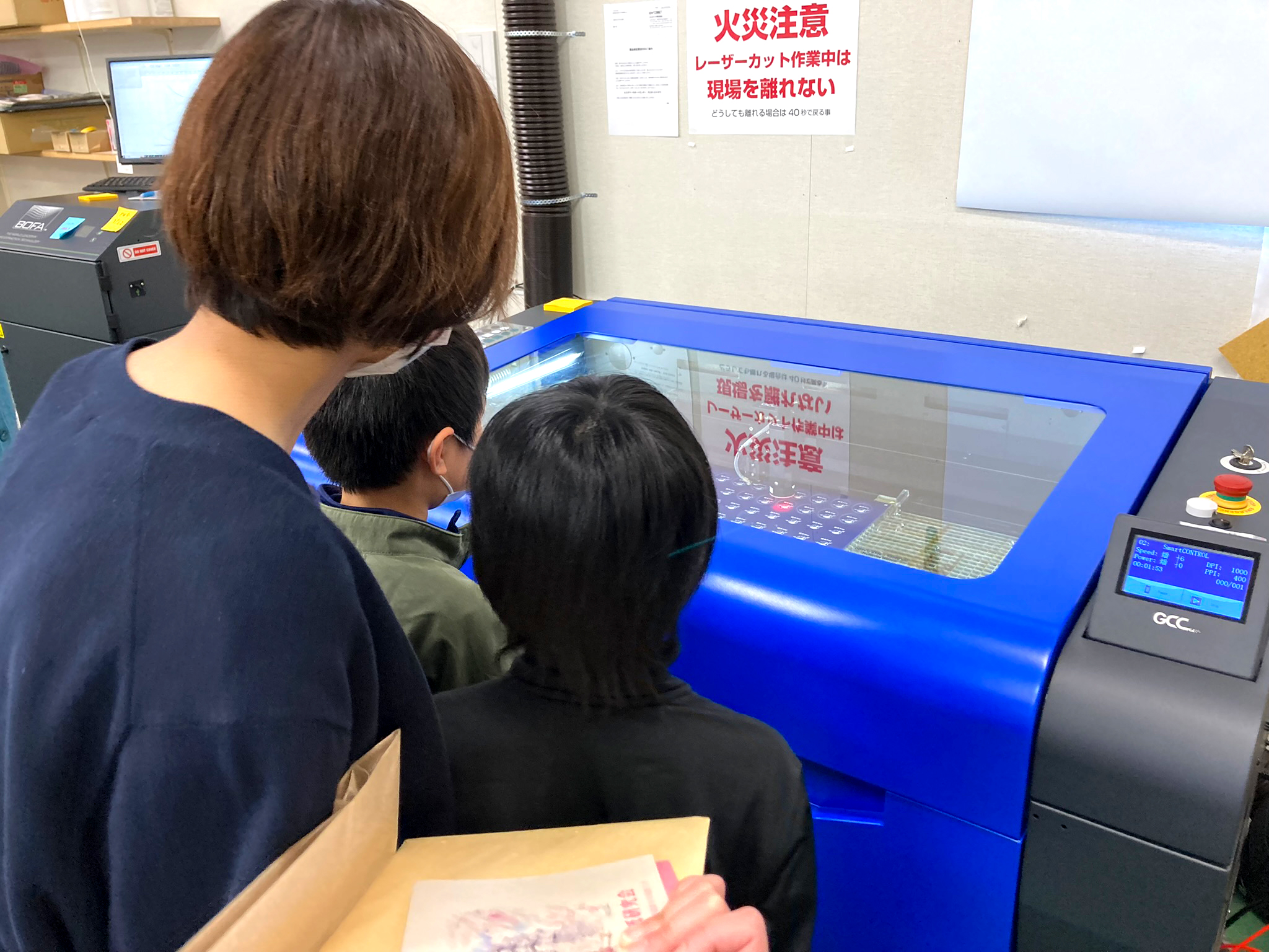 参加いただいた方は、りんごの木の枝を剪定で横長に広げていることを初めて知ったという声や剪定している畑の中を通って家に帰った親子は「これが再利用されているんだね」と、家でも話題になったとの声がありました。また、自分の書いた絵柄が実際に廃材の枝に印刷されたのを見て、レーザーの機会に興味を持ったお子さまもいました。