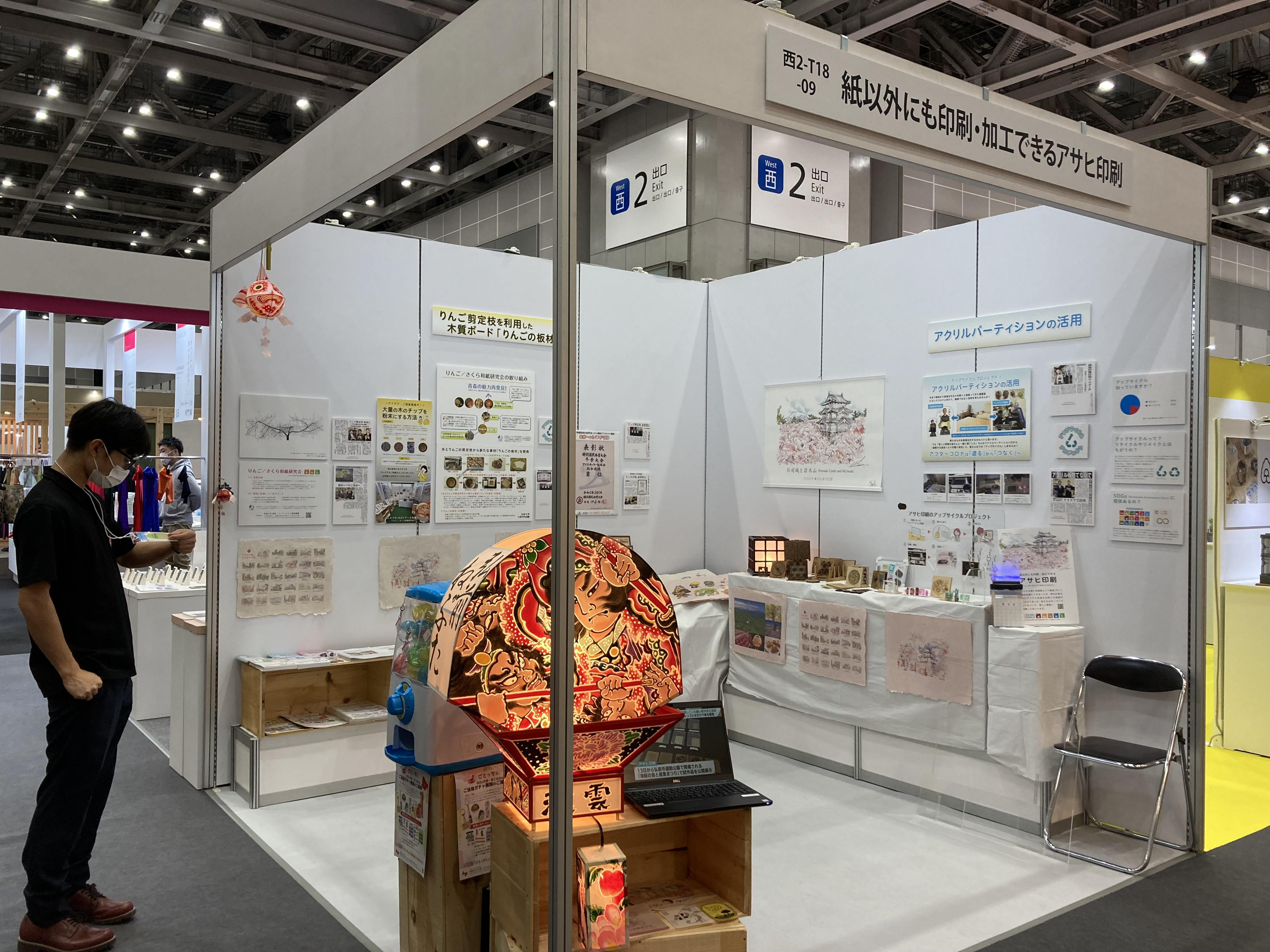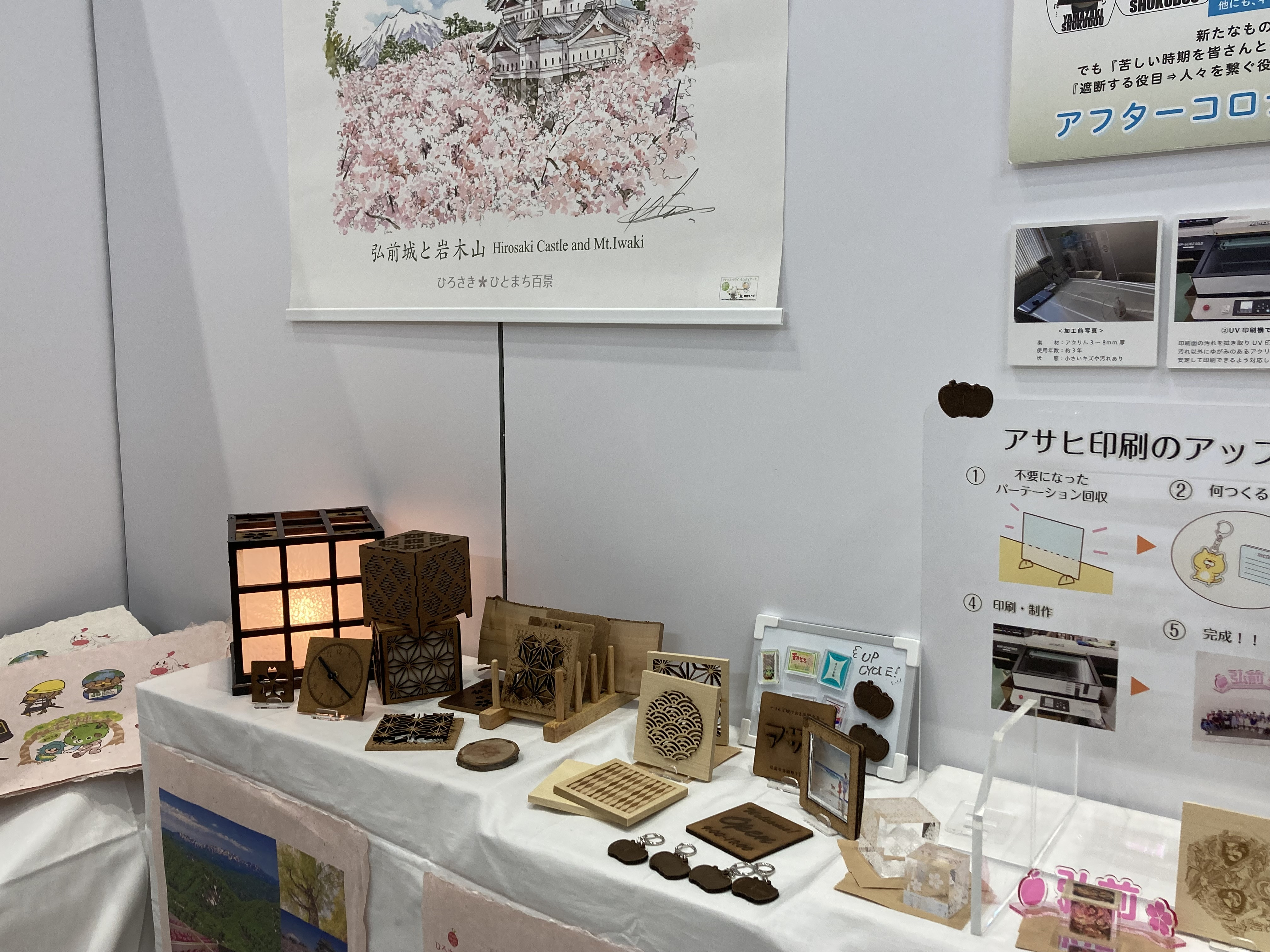 出展目的は、弘前大学と共同開発中のりんご剪定枝から作るMDF ボードと弊社で取組を進めているアクリルパーティションの再利用=アップサイクル事業に関わる展示を行い、活用の幅を広げるため来場者へアンケートを実施すること、さらに市場調査だけでなく、商品化した際の今後のお取引にかかわりそうな企業様と名刺交換をして繋がりを作ることです。