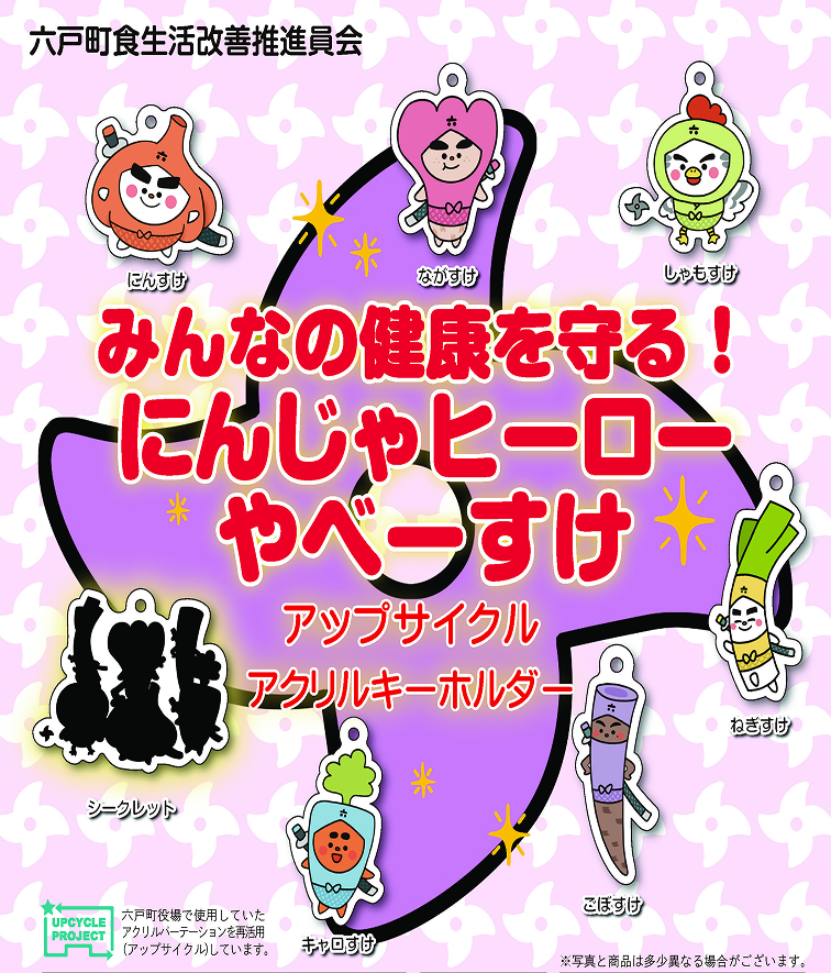 このプロジェクトは町のキャラクターをデザインしたキーホルダーを製作し、道の駅「ろくのへ」で1 個500 円で販売しました。 売上の一部は町の地域振興や健康づくりのために活用されます。